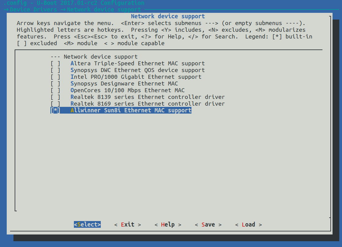 Device-Drivers -> Network device support -> Allwinner Sun8i Ethernet MAC support를 선택하고 저장한다.