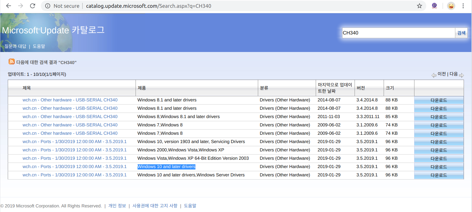 그래서 마이크로소프트 홈페이지를 검색해 보니 WCH사의 CH340/C330N 드라이버가 2019년 1월 업데이트 목록에 있다.