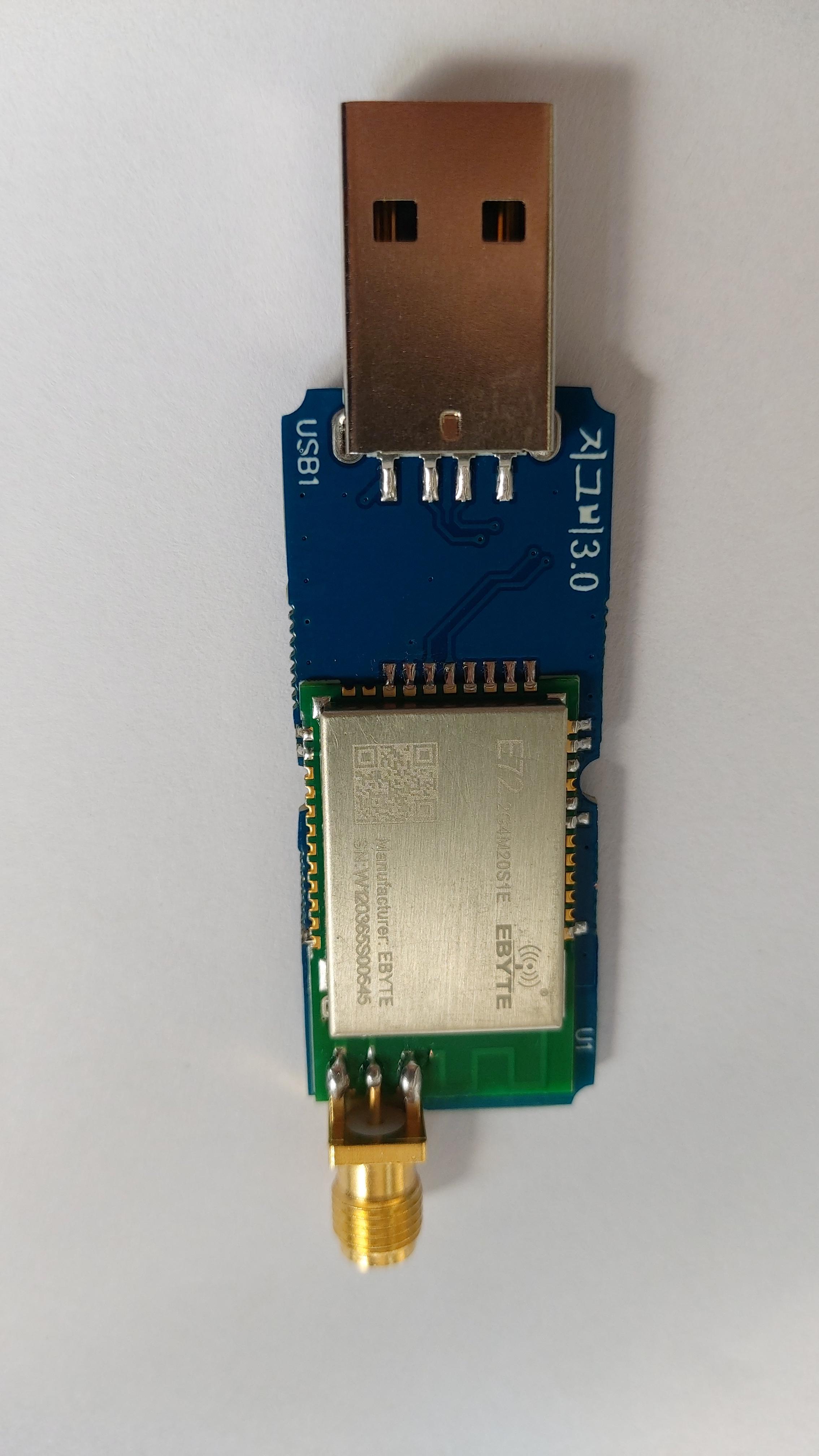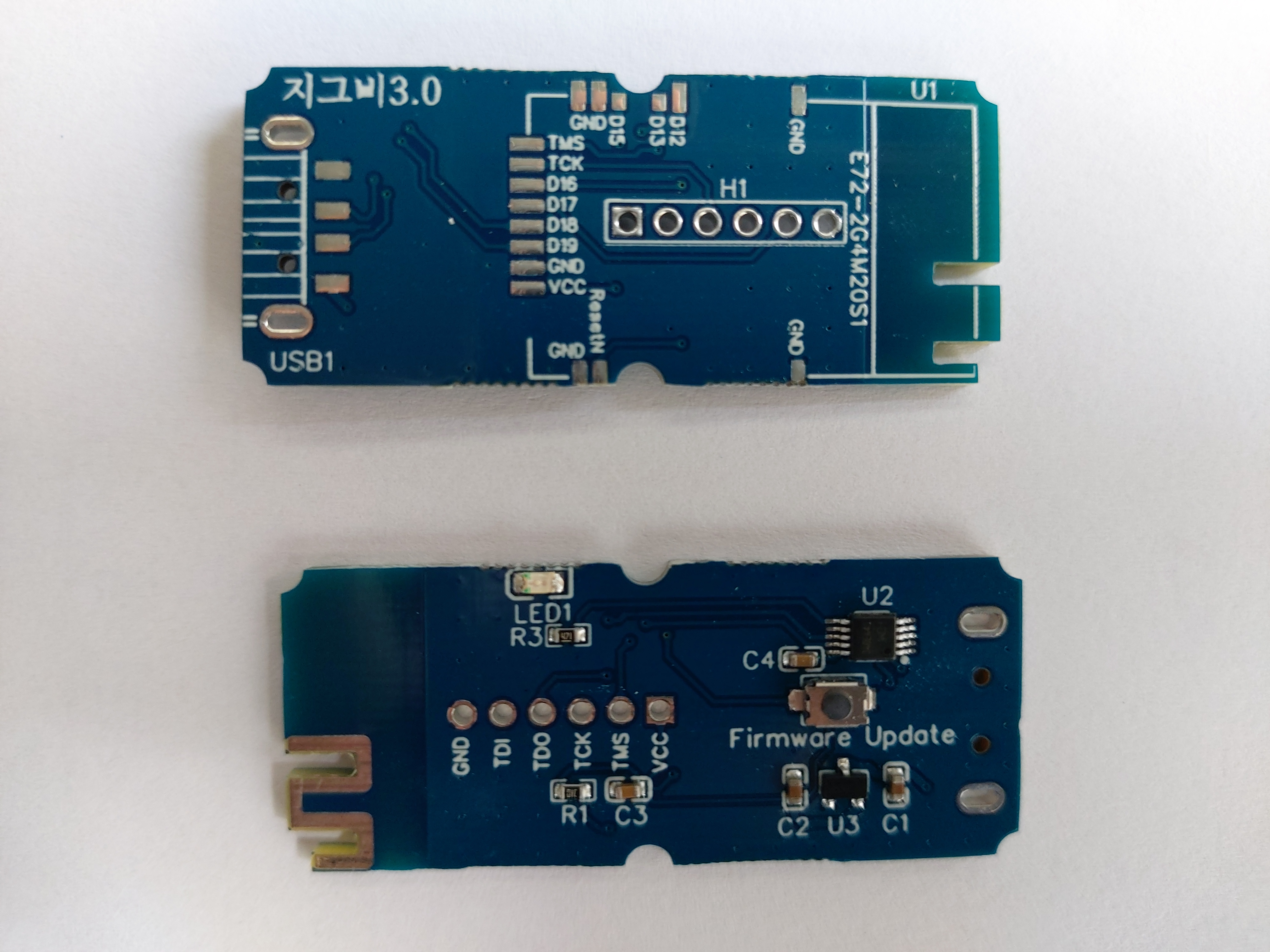 USB 동글 PCB 뒷면의 버튼을 누른채로 USB 포트에 꼽고 3~4초 뒤에 버튼을 놓으면 펌웨어 업데이트 모드로 진입합니다.