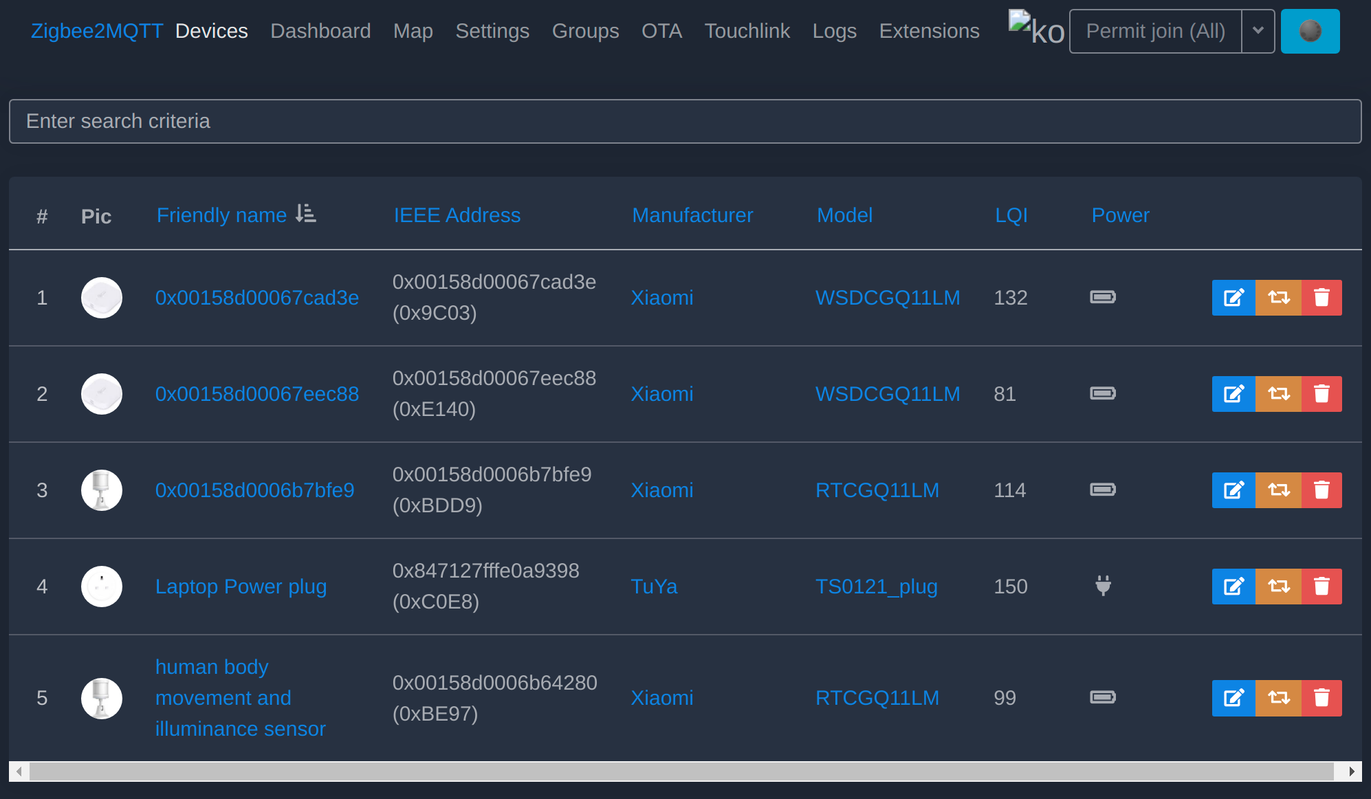 여분으로 보유하고 있는 Zigbee 장치 몇개를 연결해 보았습니다. 페어링은 문제없었고 LQI값도 준수해 보입니다.